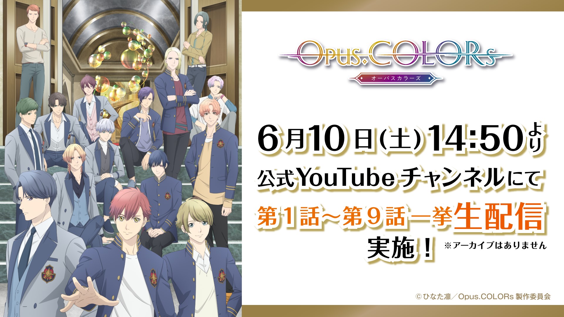 6月10日(土)14:50より、作品公式YouTubeチャンネルにて、TVアニメ『Opus.COLORs』第1話~第9話の一挙生配信を実施いたします。